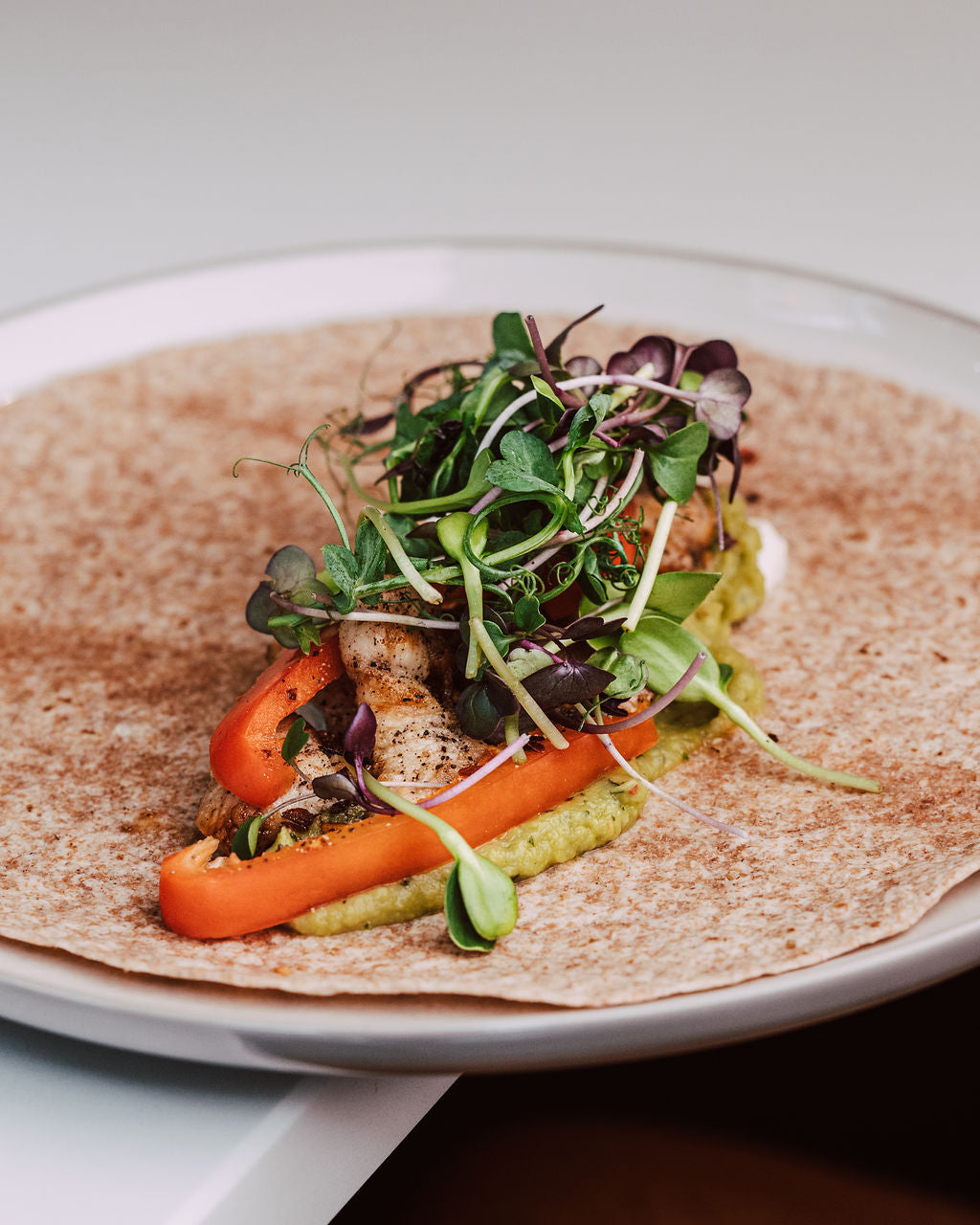 Chicken, red pepper, guacamole & creme fresh wrap with micro salad special mix